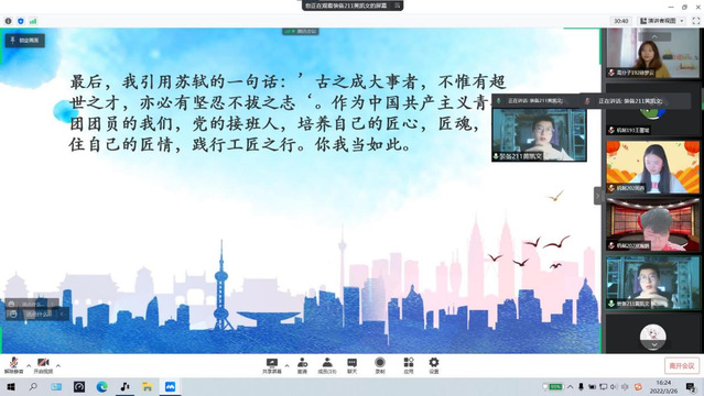 为深入贯彻党的十九大精神,迎接中国共产主义青年团成立100周年,3月26日,机械与材料工程系学习实践部于线上顺利开展“百年风华 青心向团”演讲比赛。本次活动由杨嘉昊主持,机械与材料工程系2021级同学参加。