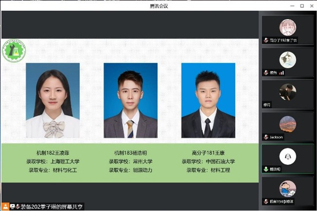 然后,我系的考研之星们介绍他们的考研经历和学习经验。并针对考研经验进行了交流,王康就为什么要考研以及如何考研等问题做了详细讲解,王凌菲从自身考研经历出发,围绕如何选取专业和院校、制定复习计划、调整心态以及复试中的注意事项等方面谈了自己的亲身体验和感受。杨浩明强调独立思考的重要性,选取专业和院校时不能盲从,并建议同学们不要只局限于与考研专业相关的书籍,应多读不同类型的书,拓宽视野。其他几位考研取得优异成绩的同学也就复试技巧等方面与同学们交流了自己的考研感受。他们一致认为,考研的成功等于正确的方法加之不懈的努力以及合适的复习材料。线上提问环节中,同学们积极提出疑问,学长学姐们针对性地一一解决问题。最后,他们为同学们送上各自的祝福寄语,祝愿大家都能取得理想的结果。