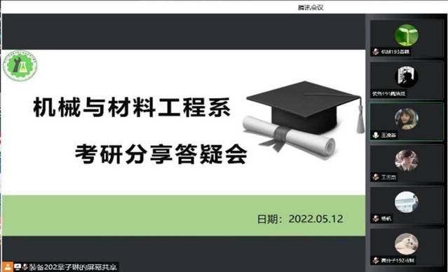 为增强同学们对考研的了解,更好地做好考研准备,5月12日晚,机械与材料工程系顺利开展“机械与材料工程系考研分享答疑会”。会议由机制204曹欣主持,同学们积极参加。