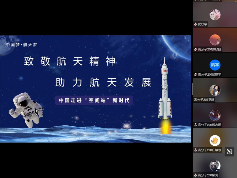 会议期间,团支书通过视频回顾了我国的航天发展史,介绍了钱学森等“两弹一星”元勋和翟志刚、王亚平等航空英雄科学报国的事迹,以此点明中国三大航天精神,指出航天精神的核心要素是爱国。会末,团支书呼吁同学们要牢记初心使命,不畏艰险挫折,将崇尚科学、探索未知、敢于创新的理想信念应用到实际。