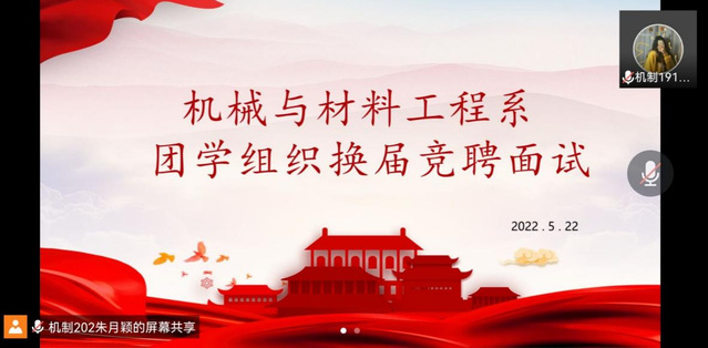 为提升团学组织活力,加强学生干部的队伍建设,积极做好团学工作的有效衔接和传承,5月22日下午,机械与材料工程系于线上开展2022年度团学组织换届面试。机械与材料工程系团总支书记张剑、团总支副书记朱潇出席本次会议,会议由团学宣传部副部长朱月颖主持,7位同学参加面试。
