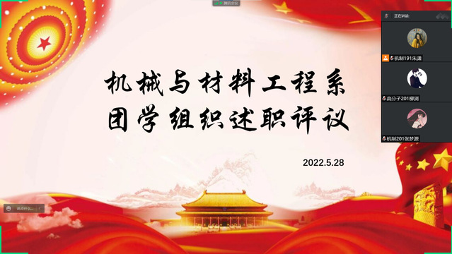 为进一步加强对团学组织干部的监督和管理,对本学期各部门开展的工作进行总结,5月28日下午,机械与材料工程系于线上开展团学组织述职评议大会。会议由机械与材料工程系团总支副书记朱潇主持,团学组织全体部长团成员参加。