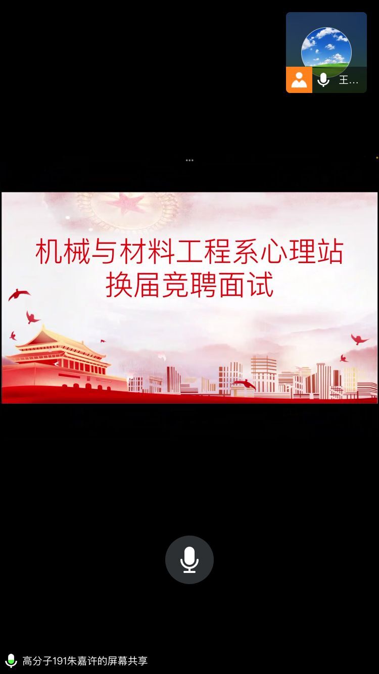 为选拔人才助力心理站的建设,更好地服务同学。5月30日下午,机械与材料工程系心理站于线上开展新一轮的换届面试,机械与材料工程系心理站站长王晶晶老师受邀出席本次会议,会议由心理站副站长朱嘉许主持,五位同学参加面试。