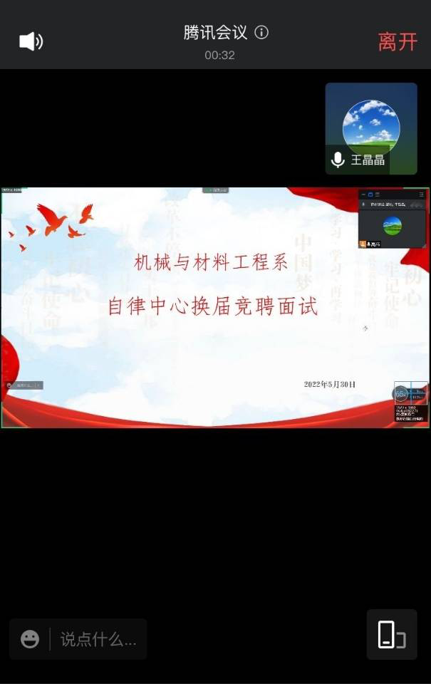 为加强自律中心组织建设,更加有效开展部门工作,保障工作的连续性。5月30日下午,机械与材料工程系于线上开展2022年度自律中心换届面试。机械与材料工程系自律中心指导老师王晶晶、自律中心主任高伟出席此次会议。会议由高伟主持,6位同学参加面试。