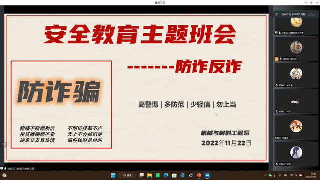 为进一步加强学生安全防范意识,防止校园诈骗情况的发生,11月22日,机械与材料工程系通过腾讯会议顺利召开了防诈反诈安全教育主题班会,此次会议由机械与材料工程系22级各班班长主讲,机械与材料工程系22级全体学生参加。