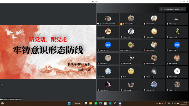 为了加强意识形态教育与引导,弘扬主旋律,建设积极向上的大学生思想意识形态,形成勤奋刻苦、斗志昂扬的良好班风,11月25日上午,机械与材料工程系通过腾讯会议顺利召开意识形态教育主题班会。班会由机械与材料工程系22级各班团支书主讲,机械与材料工程系22级全体学生参加。