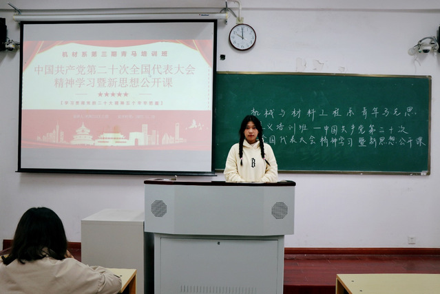 为深入贯彻中国共产党第二十次全国代表大会精神,11月20日,机械与材料工程系青马班于A213开展青马培训班第二讲暨中国共产党第二十次全国代表大会精神学习新思想公开课。团学组织部副部长王乙茹主讲,青马班全体学员参加。
