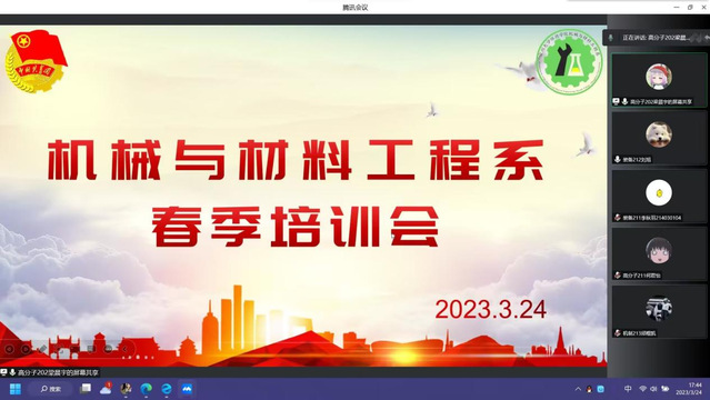 为进一步提高机械与材料工程系学生会干部的思想政治水平和工作能力,加强各部门之间的协调合作,3月24日,机械与材料工程系学生会于腾讯会议开展春季培训会。会议由机械与材料工程系学生会主席团成员梁晨宇主讲,机械与材料工程系全体骨干参加。