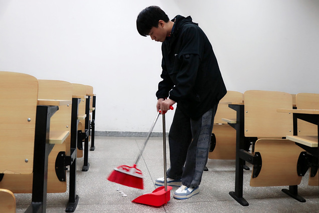活动当天,张紫媛为志愿者们分配任务,并带领大家到指定的打扫地点。首先,志愿者们对走廊垃圾、自习室桌面进行了清扫。接着大家集中整理了讲台上的教学物品,并更换了教室垃圾袋,确保自习教室地面的整洁。最后,张紫媛强调了自习教室干净整洁的重要性和必要性,井然有序地完成了清扫活动的结尾工作。