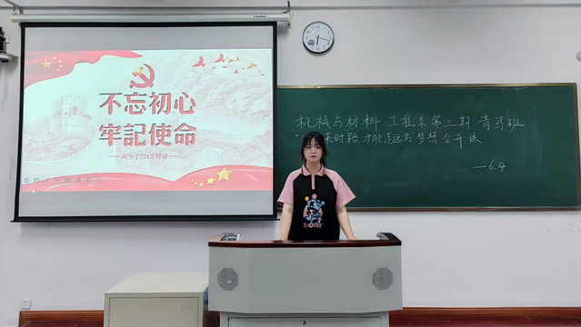 为铭记中国共产党革命先烈,提高同学们吃苦耐劳的思想意识。6月4日,机械与材料工程系第三期青马班于A107开展了“不忘来时路,才能走远方”梦想公开课。本次公开课由机械与材料工程系青马班班长李婷婷主讲,青马班全体学员参加。
