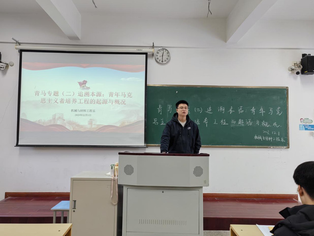 为了培育青年学生政治品格,进一步坚定青年学生听党话、跟党走的理想信念。12月1日中午,机械与材料工程系第四期青年马克思主义培训班于A103开展了青马专题二“追溯本源青年马克思主义者培养工程的起源与概况”活动。本次活动由机械与材料工程系团总支书记李柏权主讲,第四期青年马克思主义培训班全体成员参加。