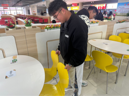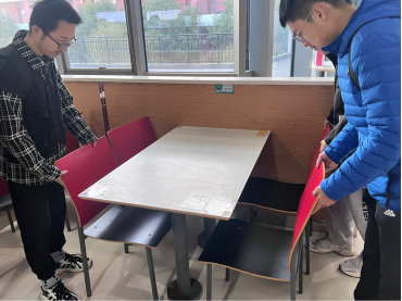 活动伊始,由两个班的组织委员带领全班同学到食堂集合,并由各班团支书对两班同学进行分组,并分配任务。接着,各班同学对食堂餐椅进行有序摆放。最后,由各班团支书对食堂餐椅摆放情况进行检查,使二号食堂变的焕然一新。