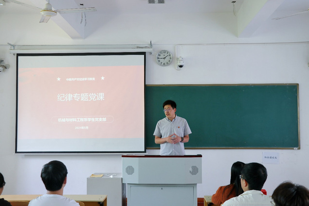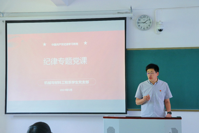 为深入学习贯彻习近平总书记关于党纪学习教育的重要讲话和重要指示精神,进一步加强学生党员纪律教育,强化纪律意识。5月9日下午,机械与材料工程系学生党支部于教学楼A204组织开展党纪学习教育专题党课。此次授课由机械与材料工程系党总支组织员王晶晶主持,机械与材料工程系党总支副书记孙科举主讲,机械与材料工程系全体学生党员参加。