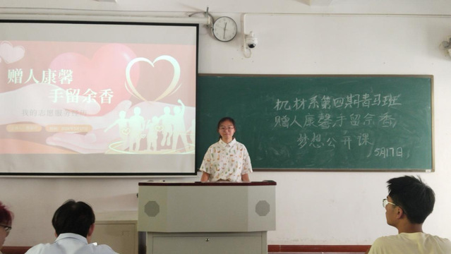为提高大学生对志愿服务的积极性,传递社会正能量,5月17日中午,机械与材料工程系青马班于A110教室开展了“赠人康馨,手留余香”梦想公开课。本次公开课由曹淑芹主持,青马班全体同学参加。