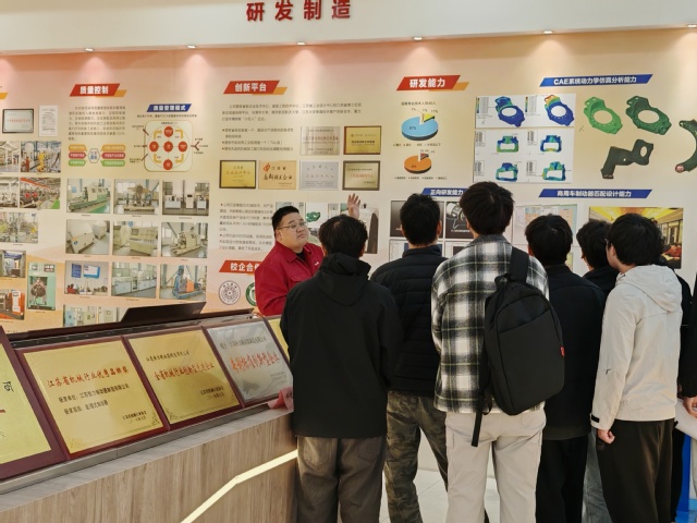 在江苏恒力制动器制造有限公司董事长徐旗钊的热情接待下,师生一行首先参观了企业的企业文化展厅,深入了解企业的发展历程、核心技术、产业布局、荣誉资质以及企业文化理念。随后,校企双方在企业会议室召开了专题交流会。徐期钊对机材系师生的到访表示热烈欢迎,并详细介绍了企业的生产经营状况、核心产品研发优势、未来发展规划以及人才招聘需求。在现场互动答疑环节,针对师生们关心的企业招聘岗位要求、薪酬福利体系、职业发展通道、实习实训安排等问题,企业人力资源部及技术部门负责人逐一进行了详细解答。