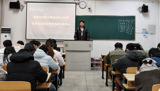 12月25号上午,机械材料与工程系学生党支部在教室召开下半年预备党员转正内外群众座谈会,对李婷婷、周顺等六名中共预备党员转为中共正式党员进行讨论和表决,会议由机械与材料工程系党总支组织员王晶晶主持,机械与材料工程系党总支副书记、学生党支部书记孙科举,全体教师党员、学生党员、党员发展对象及支部委员参加。