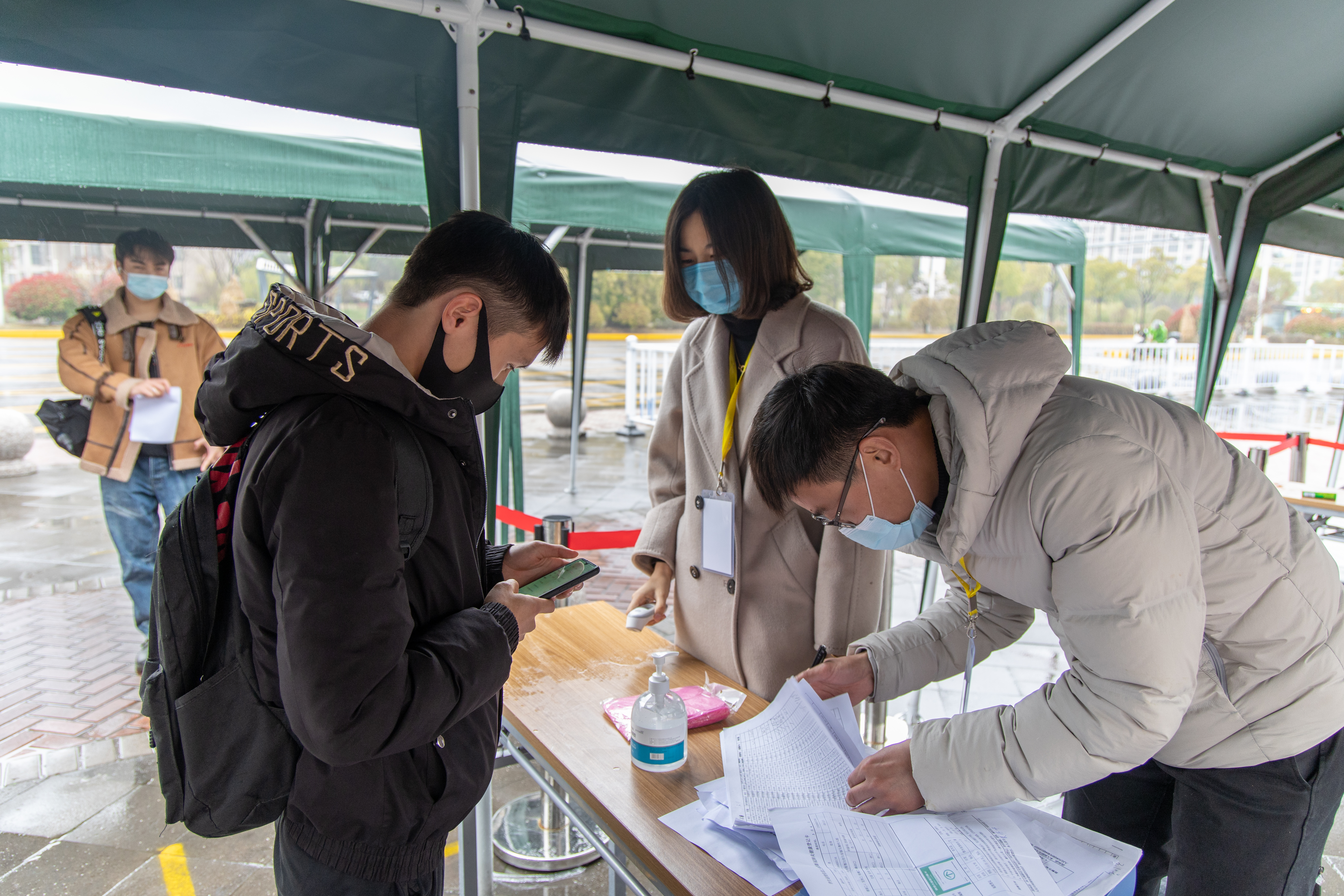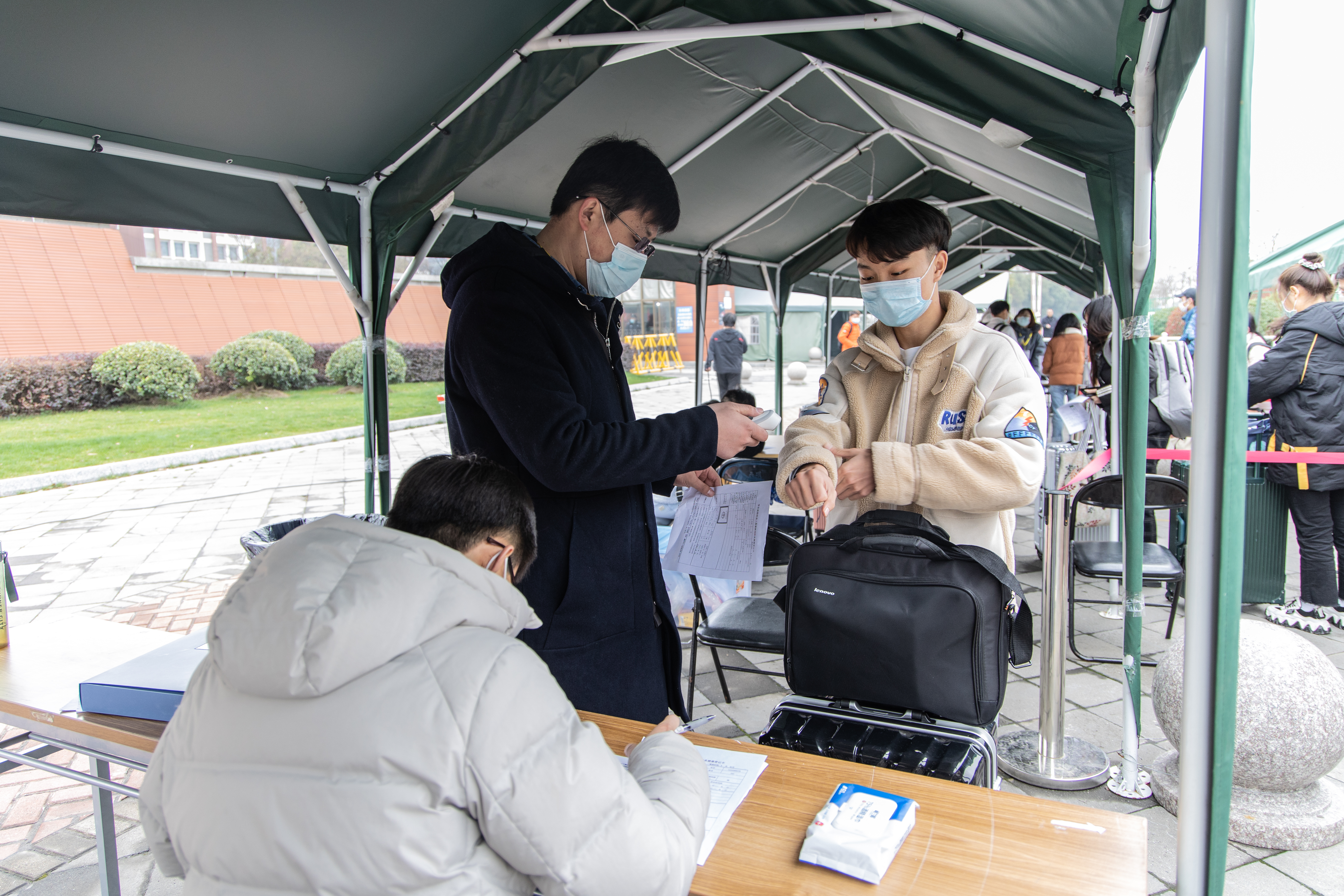 辅导员在开学前将相关的返校需知传达给所有同学,严格要求学生每天健康打卡,填写相关信息,为同学能够安全返校做好充分准备。辅导员在学院北门、西门迎接返校学生,收取健康卡、检查苏康码、测量体温,帮助同学运送行李等各项工作有效进行,带领返校同学进行核酸检测,加强学生们对疫情的防控教育。