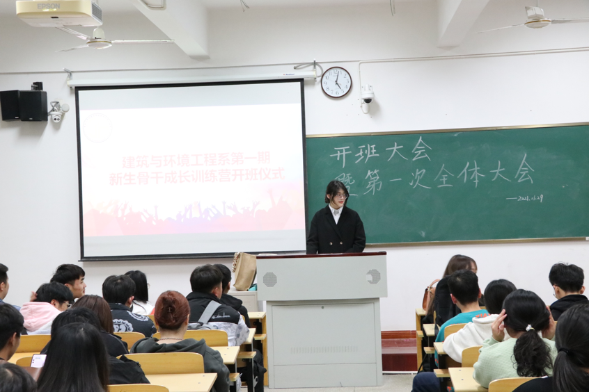 11月29日晚,建筑与环境工程系在A110召开了建环系新生骨干训练营开班大会。大会由学生会综合管理部部长张会妍主持,建环系学生会主席团成员杨舜尧、新生训练营营长陈佳敏、各班导师以及新生训练营全体成员参加。