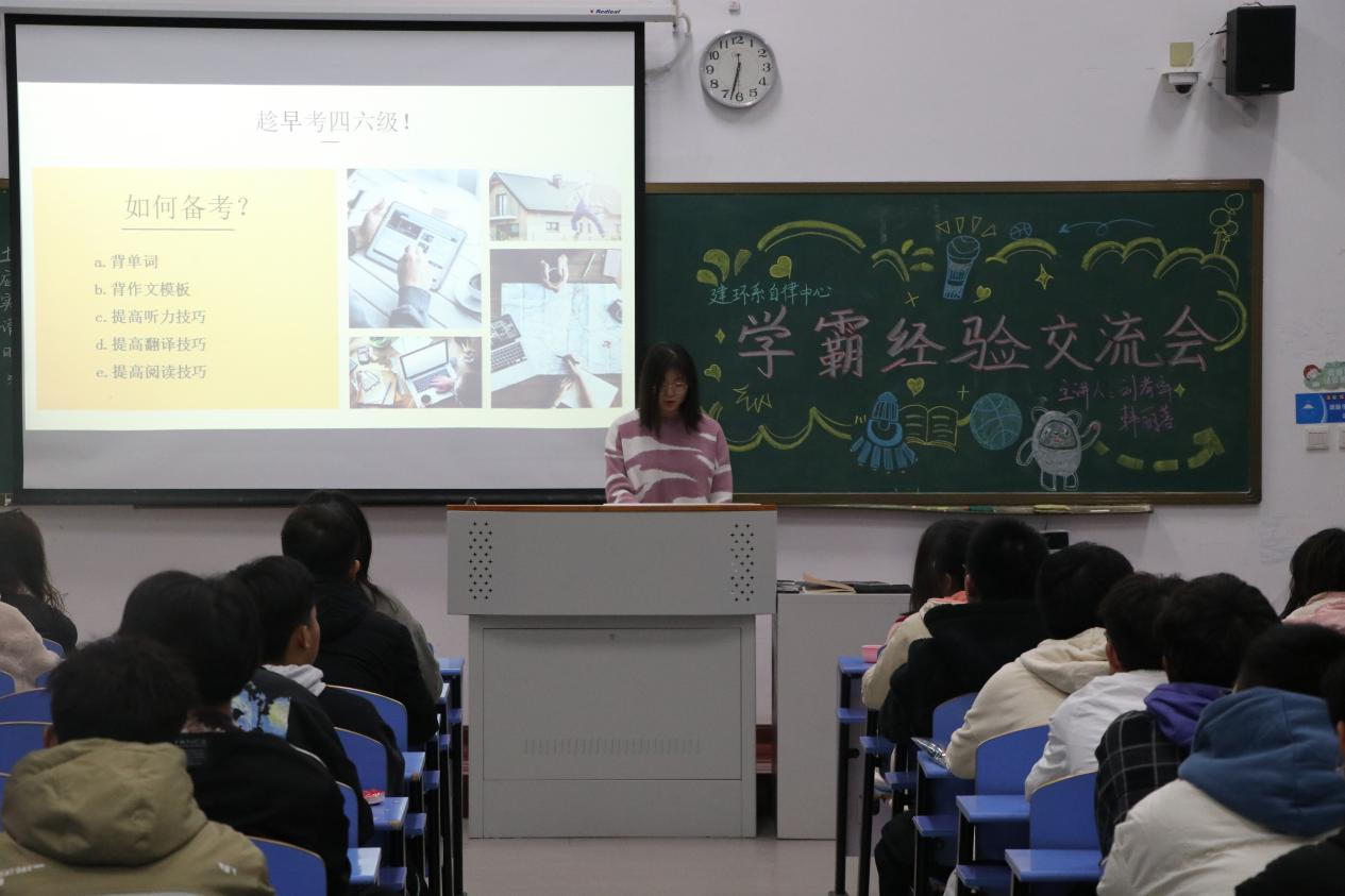 交流会上,韩丽蓉从端正学习态度,使用正确学习方法,制定计划备战四六级等方面进行分享。刘孝宇以自己的学习经验向同学们说明当前学习的重点,并强调课堂上要跟紧老师的步伐,尽量坐在靠前的位置,独立完成作业,养成良好的学习习惯。