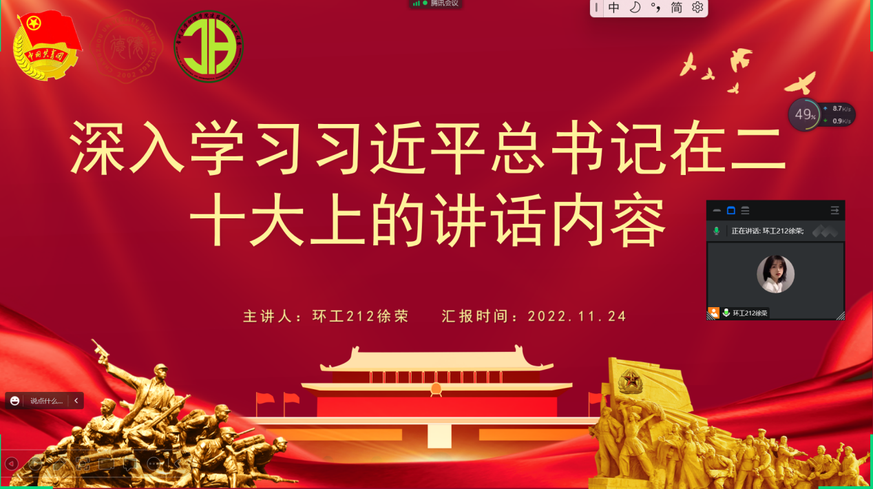 11月25日建筑与环境工程系围绕“深入学习习近平总书记在二十大上的讲话内容”为主题,于线上顺利召开。建筑与环境工程系团委宣传部副部徐荣担任主讲人,建环系22级青马学员和系团总支干部参与。