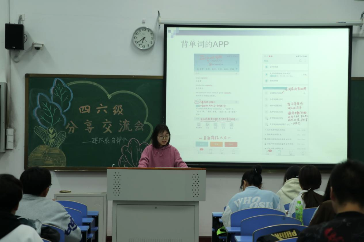 为助力建环系学生顺利通过四六级考试、掌握应试技巧,培养大一新生学习英语的兴趣。5月7日晚,建环系自律中心在C106召开了英语四六级经验分享交流会,会议由给水202顾香主讲。