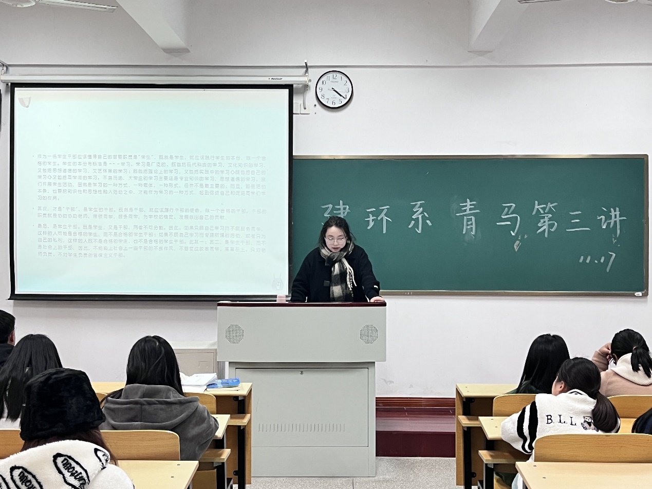 为加强学生干部与同学之间的沟通交流,进一步培养学生干部基本素养,11月17日,建环系青马工程培训第三讲“学生干部基本素养”培训于A108顺利开展。本次会议的主讲人为学生会学习部部长孙玉娇同学,建环系23级青马学员全员参与。