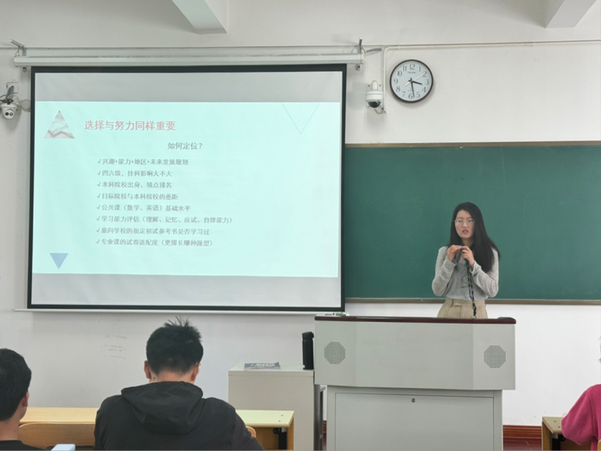 活动中,陈柯妤为同学们详细介绍了自己在考研期间的备考计划,指导同学们合理规划复习时间,突出强调英语单词积累、夯实专业知识基础、真题演练的重要性。张瑞分享了自己在专业、院校选择方面的心得,帮助同学们更清晰地进行考研规划。于航则强调了心态调整对于考研的重要性,讲述了自己在面对考研复习压力时的调节、舒缓方法,希望同学们在复习时避免过度紧张和焦虑的情绪。