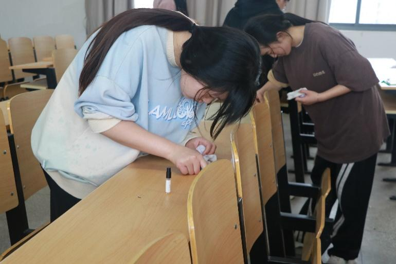 活动当天,志愿者们分工协作,在负责人的引导下粘贴姓名牌,铲除桌面上的胶印,清除抽屉、地面上遗留的垃圾,擦拭玻璃门窗等,力求不放过任何一个死角。经过一小时的辛勤劳作,考研教室卫生得到了很大改善。