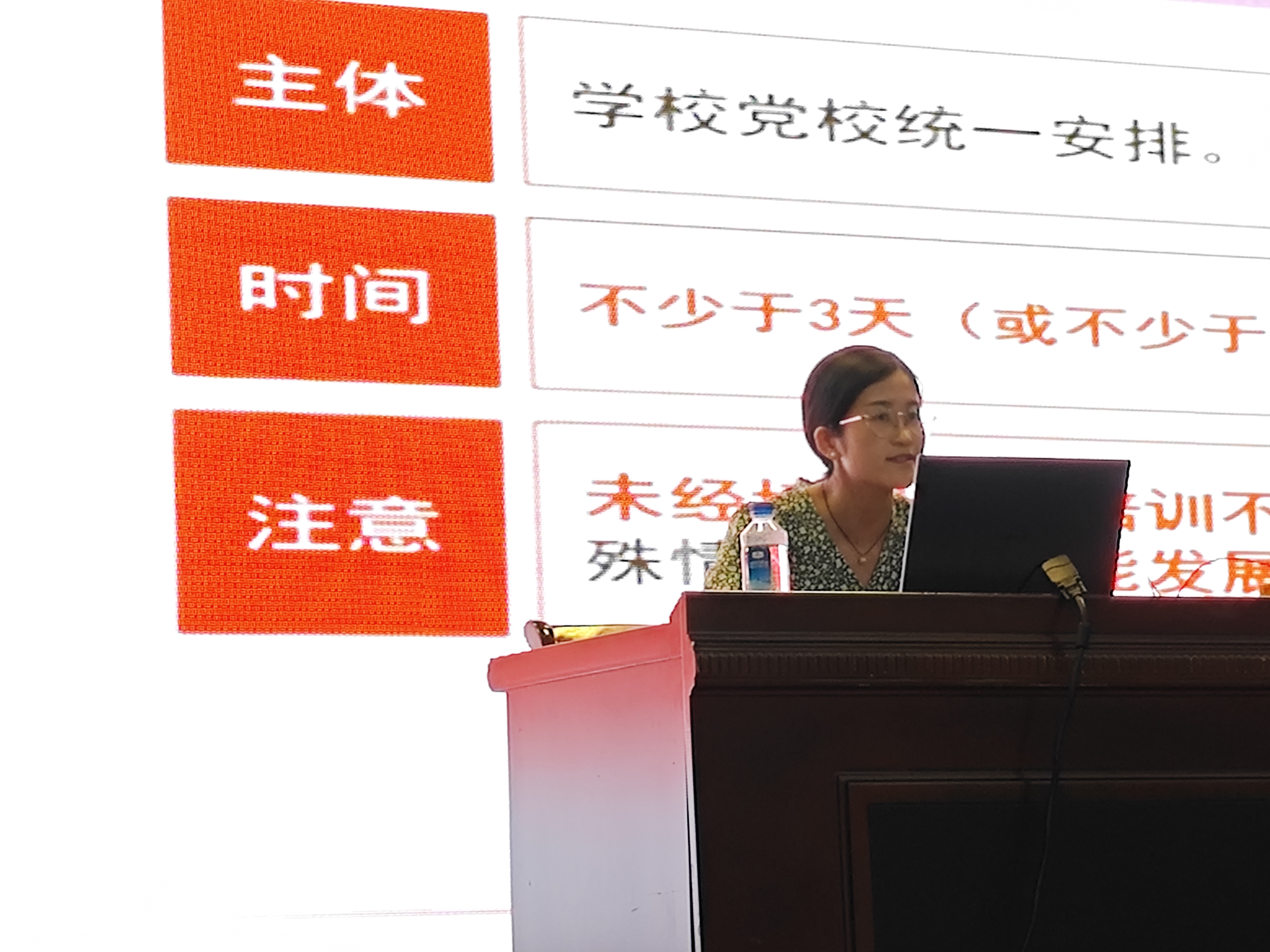 讲座伊始,现场气氛庄重而热烈。杨月以饱满的热情和深情的语调引领新生们踏上了一段探寻党、理解党的初心使命的旅程,并通过生动的案例和丰富的史实让新生们感受到中国共产党在革命、建设和改革各个时期所发挥的核心领导作用,以及党员在推动社会进步、服务人民中的先锋模范作用。接着杨月就入党需满足的条件、基本流程、入党申请书书写格式等内容分别展开讲述。同时她还强调,入党不仅是一种荣誉,更是一种责任和使命,需要在思想上和行动上始终与党中央保持高度一致,需要各位同学在日常学习生活中不传谣、不造谣,不传播错误思想,不抹黑党史、新中国史、改革开放史、社会主义发展史,不抹黑英雄人物,要积极传播正能量,争做又红又专的新时代大学生。