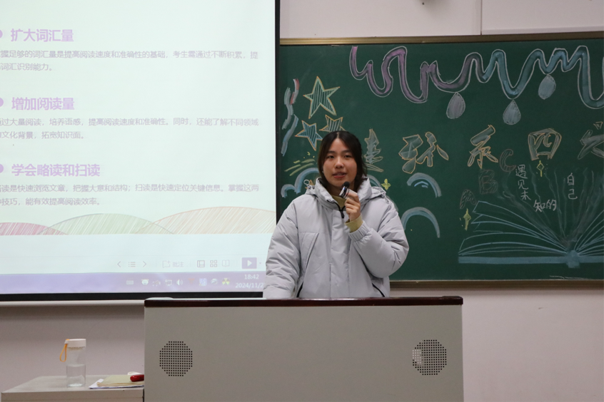 活动伊始,由严昕蕾介绍了四六级考试的题型分布和考试流程,从词汇积累、听力技巧、阅读策略、写作方法等方面进行了详细讲解·。在互动环节,严昕蕾统计了大家的备考情况,并给出了全面详细的方案供新生们参考,以便让同学们更好地应对考试。