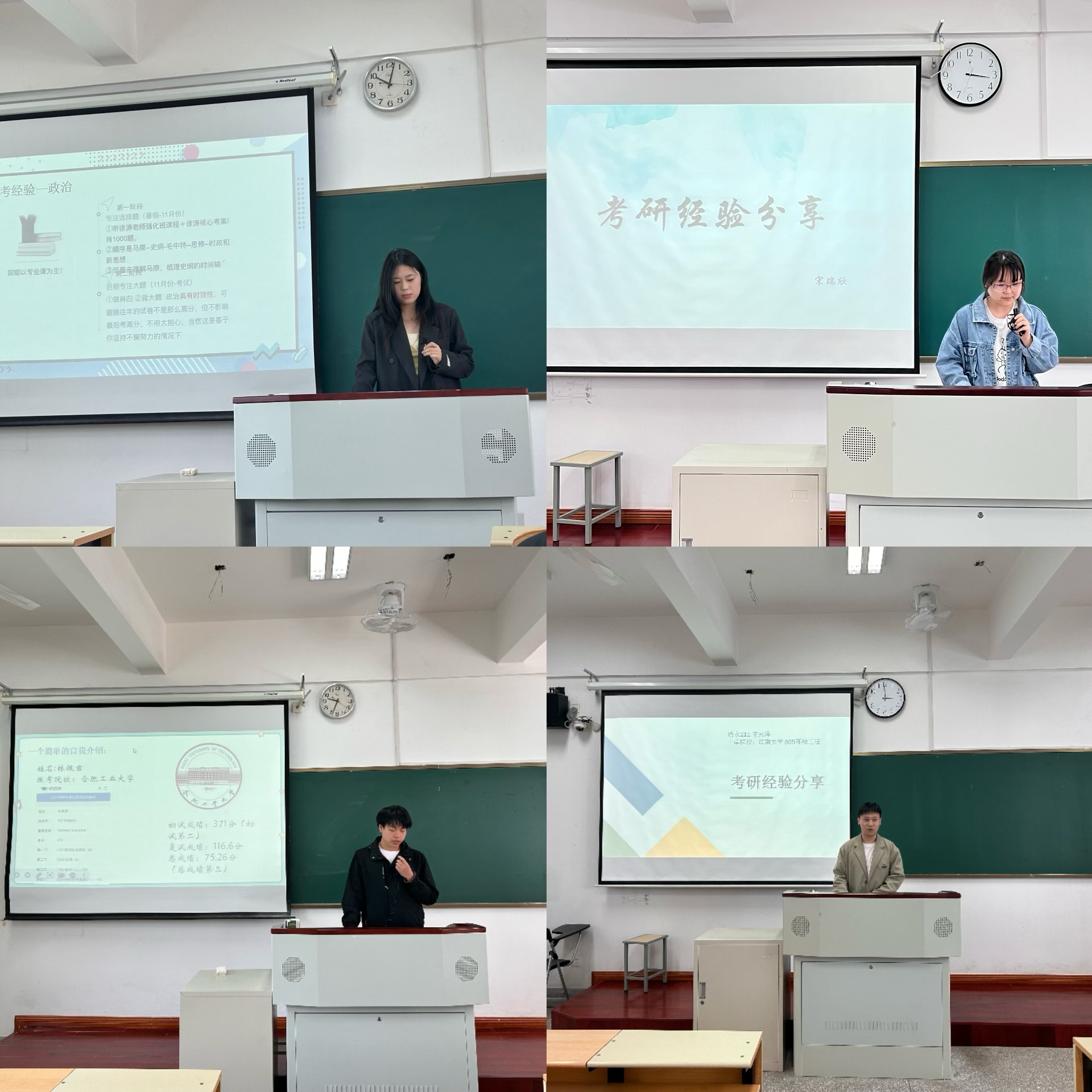 会议过程中,四位同学结合自身经历,从院校专业选择、备考时间规划、学科学习方法、复试注意事项等方面展开分享;宋瑞欣强调院校选择要结合报录比与个人实力,不要盲从,要学会独立思考;王元泽分享分阶段复习计划并重点讲解公共课和专业课学习技巧;林佩君和于琴分别分享了他们心态调整的不同方法。学长学姐们耐心细致地逐一解答同学们的疑惑,现场氛围热烈融洽。最后,不少同学表示收获颇丰,对考研有了更清晰的认识和规划,增强了备考信心。
