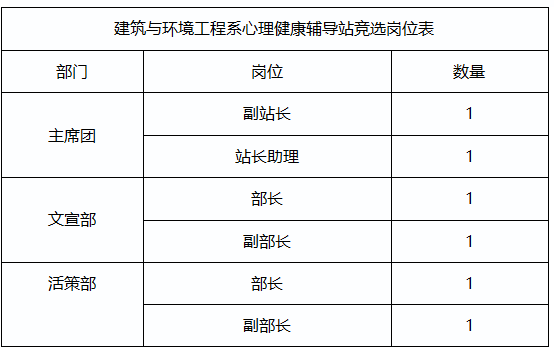 为保证系部心理工作顺利开展,宣传心理健康知识,开展心理健康相关活动,进一步加强建环系心理站建设,更好地帮助学生健康快乐的成长,现将建环系心理站工作人员换届选聘有关事项通报如下: