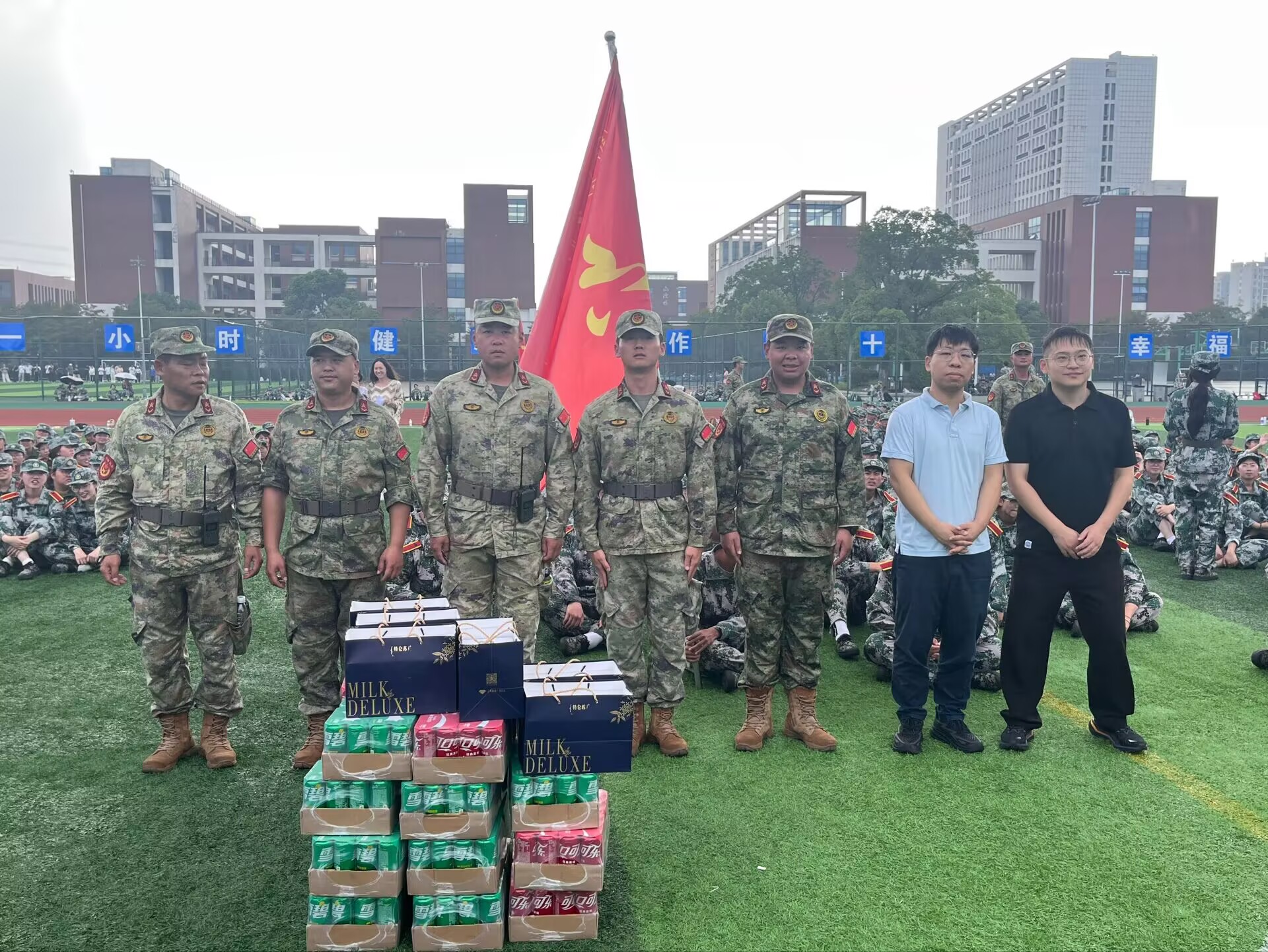 唐杰现场查看了新生军训队列训练、对25级新生展现出的昂扬精神状态、整齐划一的动作及不怕苦累的训练态度给予高度肯定。他勉励新生们珍惜军训时光,在烈日与汗水的磨砺中传承建环系优良作风,同时叮嘱同学们注意防暑防晒、及时补充水分,确保安全顺利完成军训任务。此外,代表全系师生向辛勤付出的教官们致以诚挚感谢,并为教官及新生们送上饮用水、清凉药品等慰问礼包。