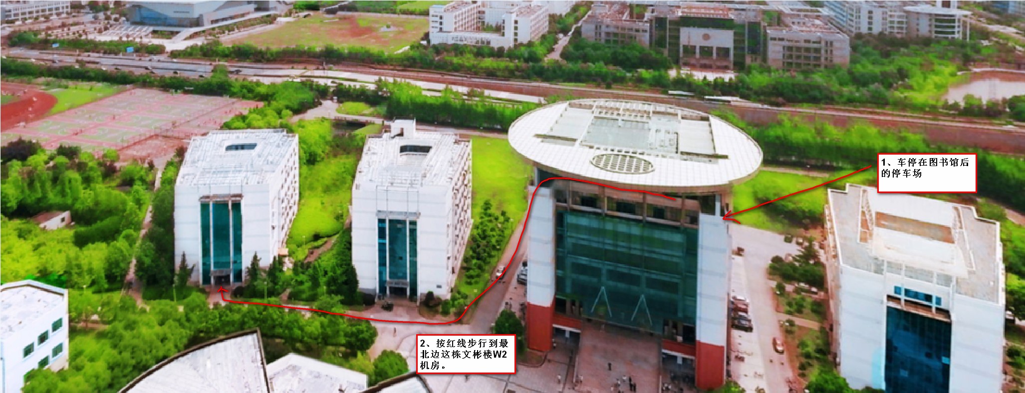 各位同学好!本次计算机考试班车安排如下:3月24日(周六),靖江校区北大门11:15发车,武进校区图书馆后面停车场19:00发车。 备注: 1、所标时间均为发车时间,请提早到达停车地点准备乘车,以免错过! 4、请各位同学查看路线:图书馆后面停车场下车,跟图书馆并列,右手边第二幢就是文彬楼,文彬楼二楼W2机房,详见图片。