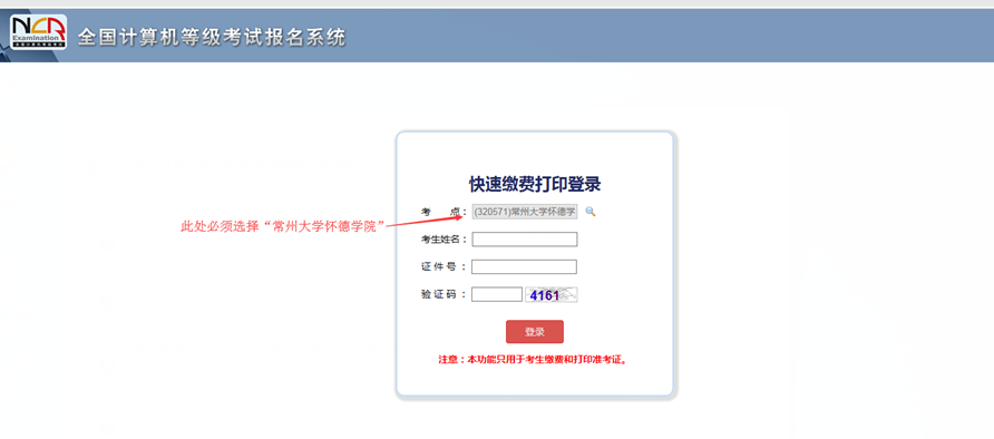 缴费注意事项如下: 1、缴费时请用电脑进行支付,支付方式为支付宝或者银行支付,缴费前请认真核对个人信息及报考语种。 2、服务器开放缴费时间为每天7:30---22:00。缴费时请在一个小时内完成,以避免影响缴费结果,请不要重复缴费。 3、网上缴费时间:2019年6月24日-2019年7月4日 4、不在规定时间内缴费的考生,系统默认为放弃该次报名。 5、登录过程中出现无法登录的情况,这是由于登录人数多的缘故,请耐心多登录几次。 具体步骤如下: 1、缴费登录网址:http://218.94.50.12/NCRE_EMS/FastLogin.aspx 选择考点:泰州 320571 常州大学怀德学院,输入考生姓名,证件号,验证码。