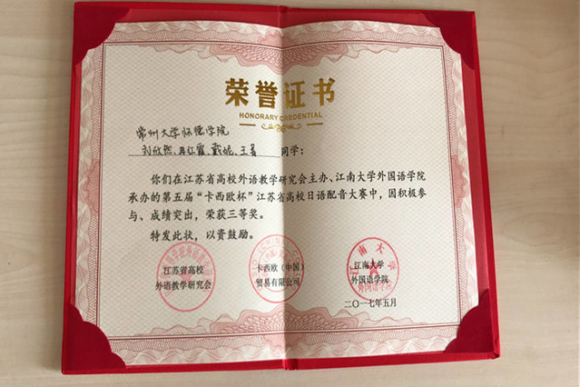 5月20日,由中国日语教学研究会江苏分会主办的第五届“卡西欧杯”江苏省高校日语配音大赛在江南大学举行。我院日语专业刘欣然、冉江霞、戴妮、王菁四名学生在李莲花老师和外教原野哲的指导下,凭借对作品《生而为男子的话》的精彩演绎,荣获全省三等奖的好成绩。