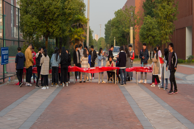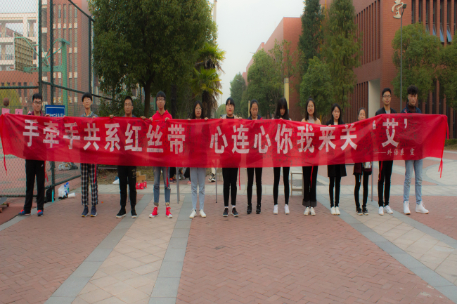 本次活动的主题是“手牵手共系红丝带,心连心你我共关‘艾’”,以在横幅上签名的形式展开。活动现场还有志愿者分发宣传资料,呼吁大家平等对待和关怀艾滋病患者。活动现场气氛活跃,同学们积极参与并在横幅上签名留言。