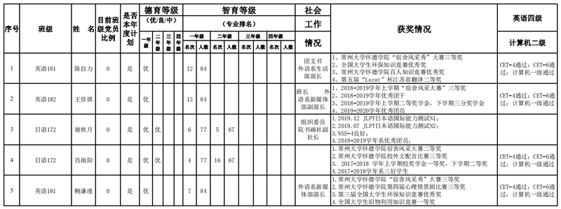 据我校发展学生党员公示制度的有关规定,经外语系学生党支部讨论决定和怀德学院党委审议,拟发展下列同志为中共预备党员。现将基本情况公示如下:
