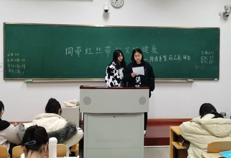 12月1日是第33个世界艾滋病日,为普及艾滋病毒防控相关知识,唤起同学们对艾滋病病毒及其携带者的正确认识,外语系紫荆志愿团于A311、313教室开展了预防艾滋病宣传活动。