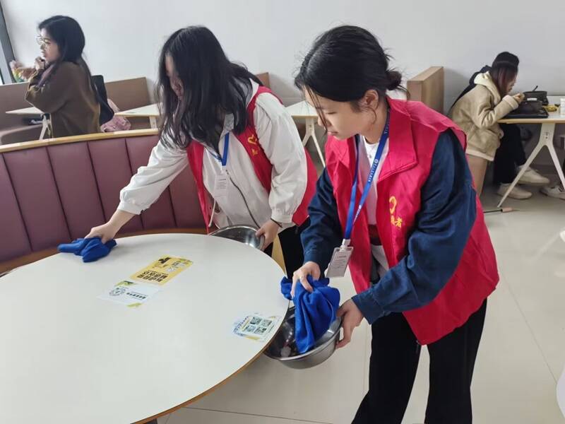 活动期间,志愿者们积极参与到食堂卫生打扫中,收拾桌面,整理餐盘,协助工作人员清洁食堂。在志愿者们的共同努力下,为全校师生营造出了温馨、和谐的用餐环境。