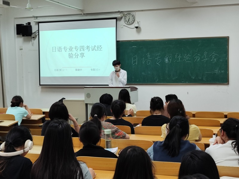 日语专业四级考试临近,为帮助日语专业同学更科学地备考,5月28日晚,外语系于A101举办了专业四级考试经验分享会。分享会邀请日语211陈建宇主讲,2022级日语专业同学参加。
