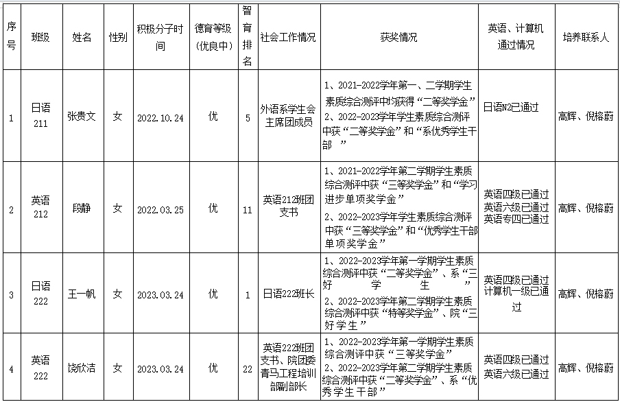 外语系学生党支部2024年上半年拟发展党员公示