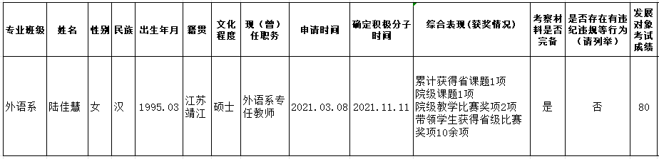 根据我校发展教工党员公示制的有关规定,经外语系教工党支部讨论决定和常州大学怀德学院外语系党委(党总支)审议,拟发展下列同志为中共预备党员。现将基本情况公示如下: