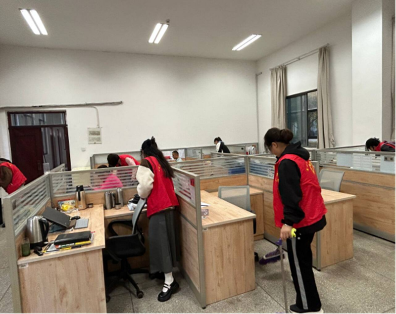 此次志愿内容为清扫B楼一楼各办公室。入党积极分子们身着志愿者服装,分工明确、干劲满满,细致地清理卫生死角与盲区。打扫过程中,大家不怕苦、不怕累,清扫过程有条不紊,充分显示出我系入党积极分子的劳动热情。