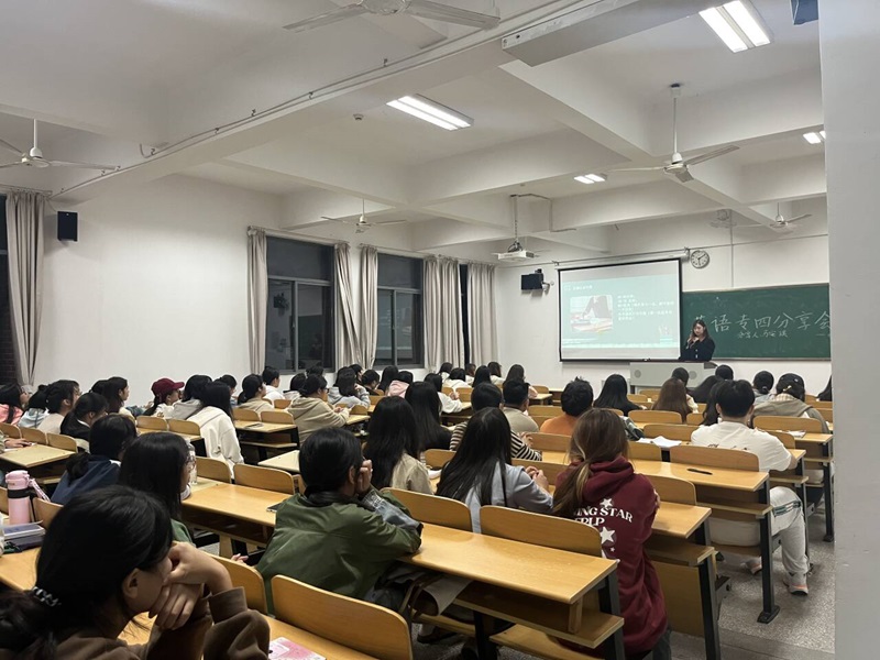 为激发同学们的学习热情,助力同学们备考英语专四考试,11月14日下午,外语系在A103教室举办了英语专四考试经验分享会。本次分享会由英语221班马安琪同学主讲,2023级英语专业同学参加。