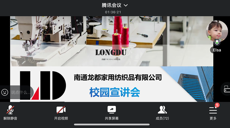 为拓宽就业渠道,增强学生对职场的了解,11月21日,成功举办南通龙都家用品纺织公司线上招聘宣讲会。此次宣讲会吸引了日语、英语专业的众多学生参与。