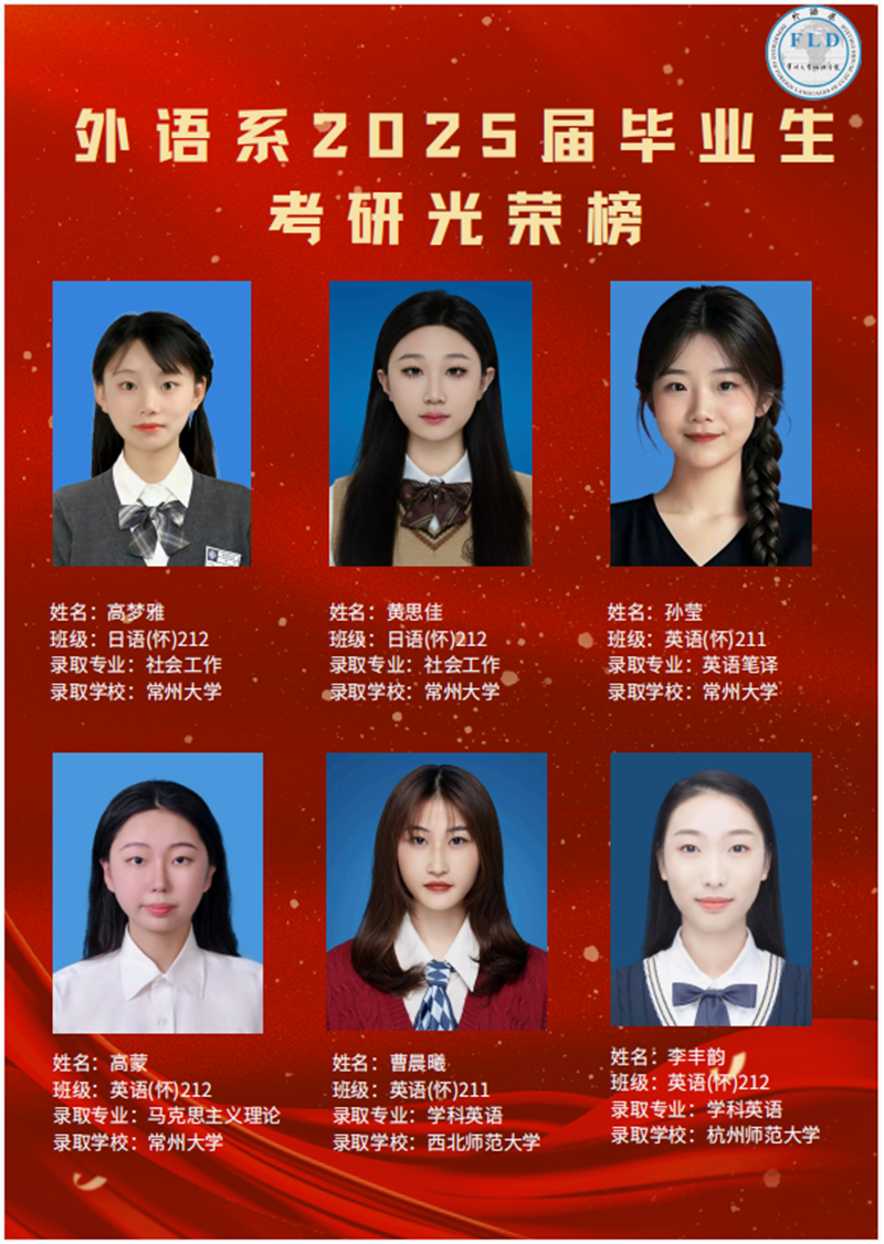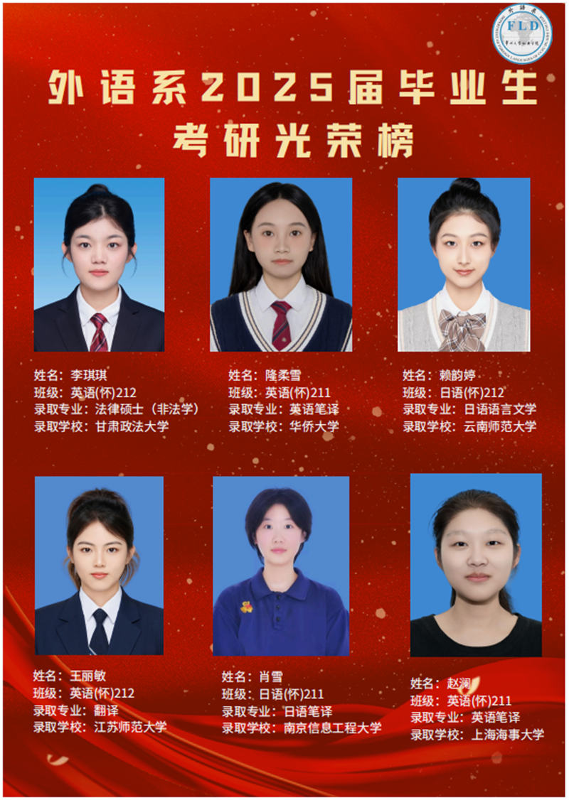 “追风赶月莫停留,平芜尽处是春山。”在2025年全国硕士研究生招生录取的激烈角逐中,外语系2025届学子以笔为剑、以梦为马,凭借着坚韧不拔的毅力、日复一日的刻苦钻研,成功叩开了理想学府的大门,交出了一份令人瞩目的考研答卷。外语系2025年毕业生共32人报考研究生,总计12人被省内外高校录取。这一佳绩,是莘莘学子日夜拼搏的结晶,更是外语系多年来坚持“立德树人”、深耕教学与学风建设的生动注脚。希望我系学子以此为榜样,继续加油!(通讯员/高辉 审核/童清泉)