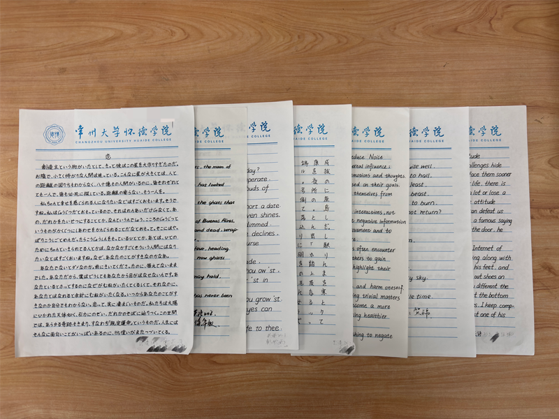 参赛选手需以英文、日语等外语文字进行书写创作。选手们笔尖流转、字迹优美,充分展现了扎实的语言基础与独特的艺术表达力。评审教师从书写规范性、整体艺术性、创意表达等方面对作品进行综合评定,最终评选出一等奖、二等奖、三等奖及优秀奖若干名。