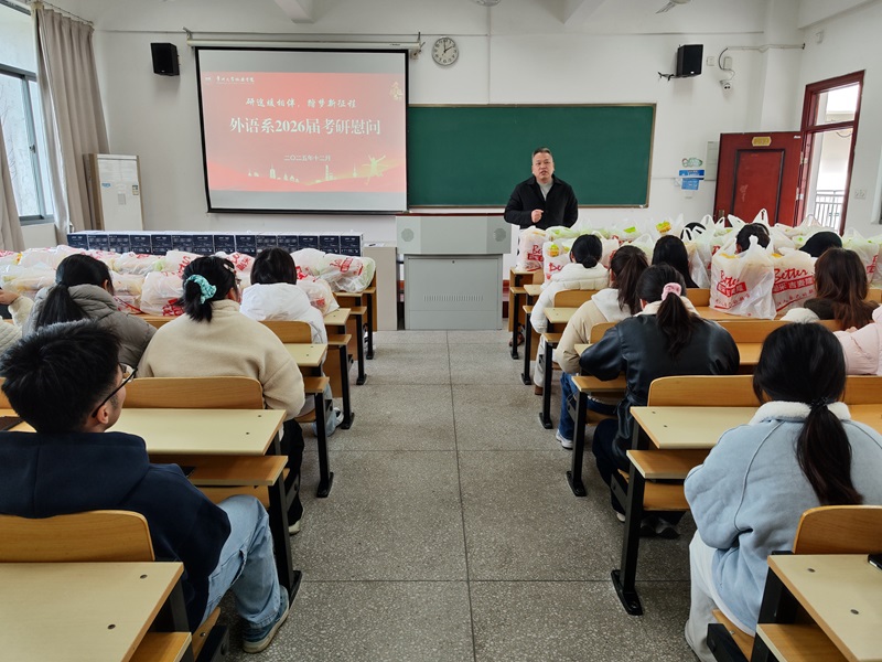 为激励考研学生以饱满的精神和最佳的状态参加考试,12月2日,外语系于A202开展考研慰问活动。学院党委副书记、副院长刘育猛、外语系党总支书记童清泉、副书记尹晓娟、辅导员高辉、倪榕蔚参与活动。