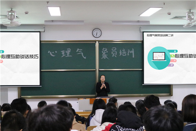 1031日晚,我院心理自助中心第二讲心理气象员培训活动在J105顺利举行,院心理自助中心指导老师马文喆、2018级全体心理气象员以及各系部心理辅导站站长参加了此次培训。